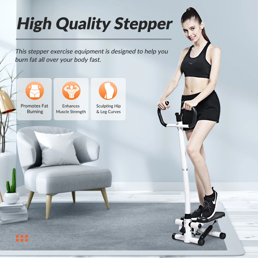 Achieve Your Fitness Goals with Ease. This stepper exercise equipment is designed to help you burn fat all over your body fast. Mini Stepper With Handlebar will help tone your whole body, specifically working your thighs and buttocks. This stepper has handle bars to help keep you balanced while you step.