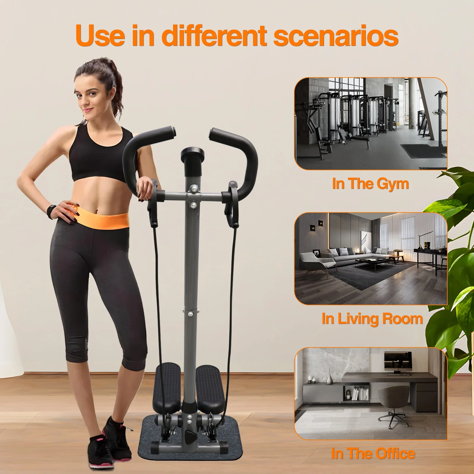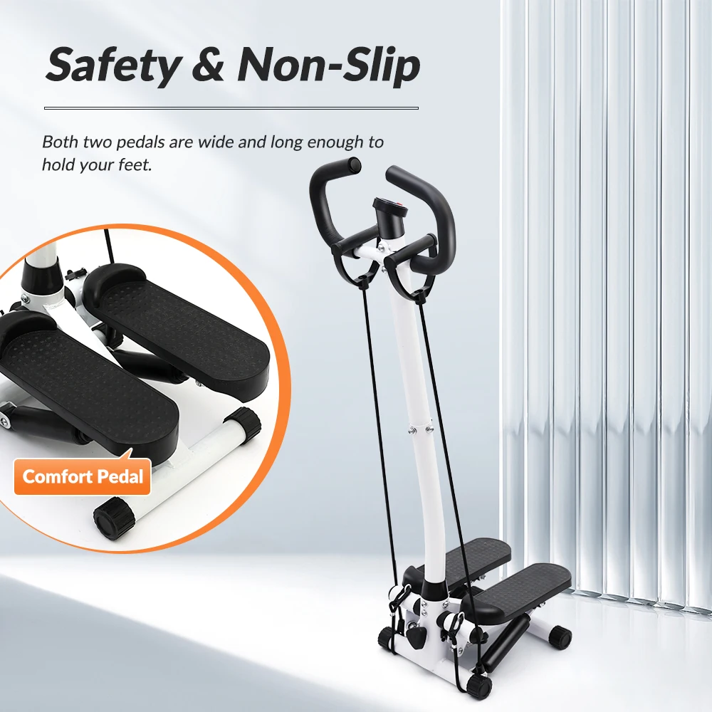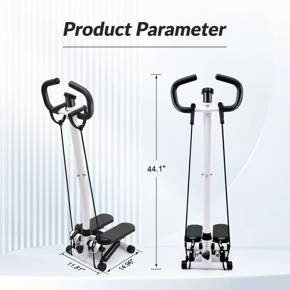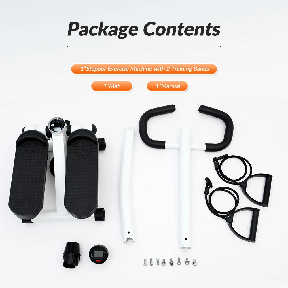 Comes with 2 Training Bands. Twist Stepper Machine with Resistance Bands accommodates users of different heights with adjustable stepping height. Training bands are closely attached with the stepper and they can work your muscle at same time. This exercise machine is effective and healthy for your ankle, knee, waist and arms.